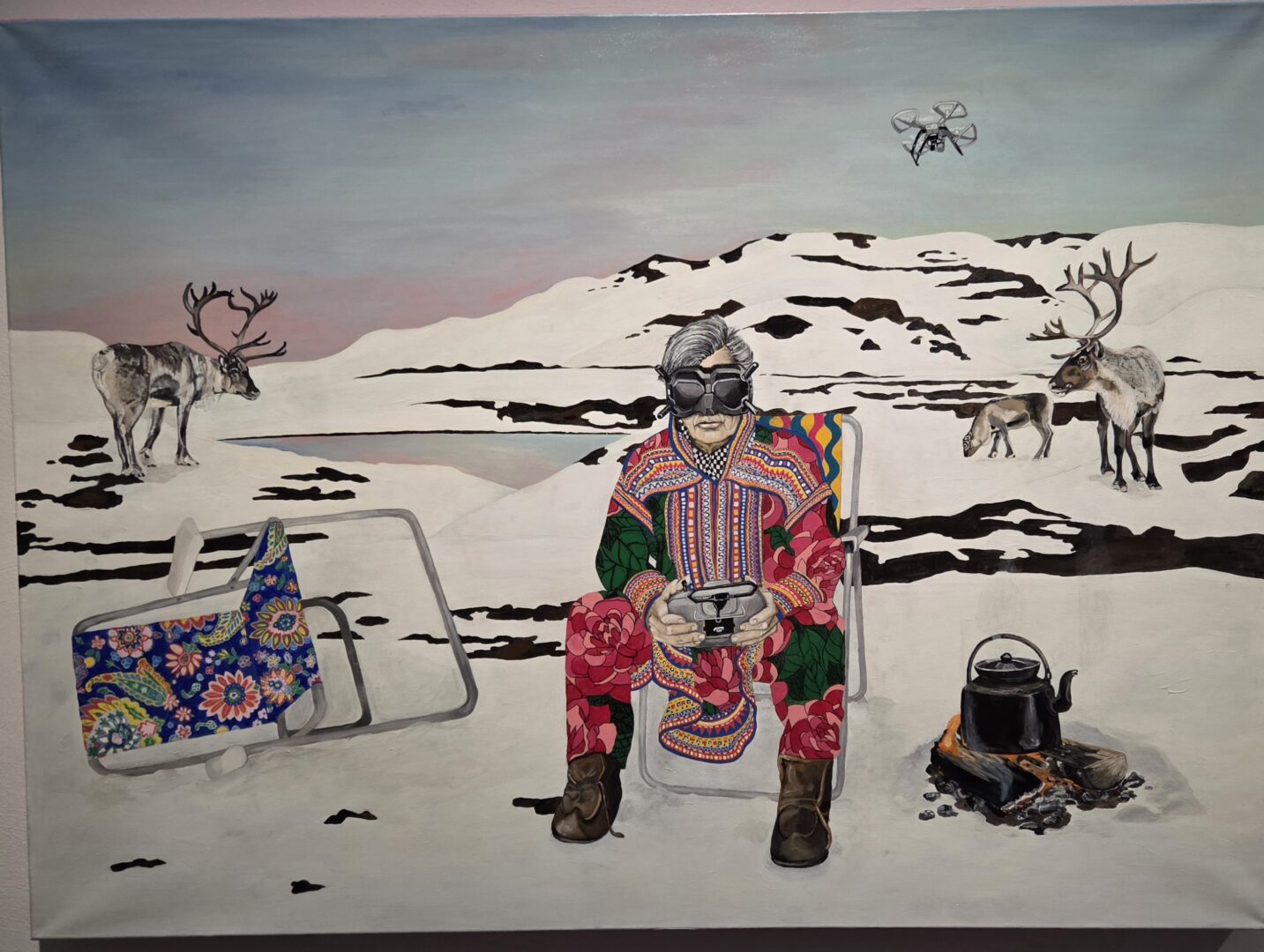 Taideteoksen edessä istuu saamelaismies erikoislasit silmillä. Hän ohjaa oikealla takanaan lentävää droonia. Tuo Kiasman ja Saamelaismuseon Siidan yhteisnäyttelyn teos Kiasmassa olisi jäänyt minulta muuten pikaiselle huomiolle, jollei teoksen nimi olisi pysäyttänyt minut: Drooni. Teos sai erilaisen, laajemman merkityksen Suomeen pudonneiden droonien takia. Teos pysäytti katsomaan saamelaisten tärkeää elinkeinoa ja elinoloja ja samalla se vei ajatukseni porotokkien valvonnasta Euroopan yli Lähi-Itään asti.